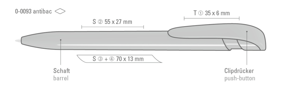Druckkugelschreiber mit gedeckt glänzendem, antibakteriellen Gehäuse und breitem Bogenclipdrücker. Der nach ISO 22196:2011 geprüfte antimikrobielle Zusatz aus Silberionen verleiht dem Kunststoff eine antibakterielle Wirkung, die eine Haftung und Ansiedlung von Bakterien oder Krankheitserregern auf der Oberfläche des Schreibgerätes um 99,99% verringert.