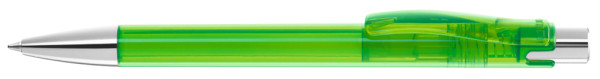 Druckkugelschreiber mit transparent glänzendem Gehäuse, Metalldrücker und schwerer Metallspitze glanzverchromt.
