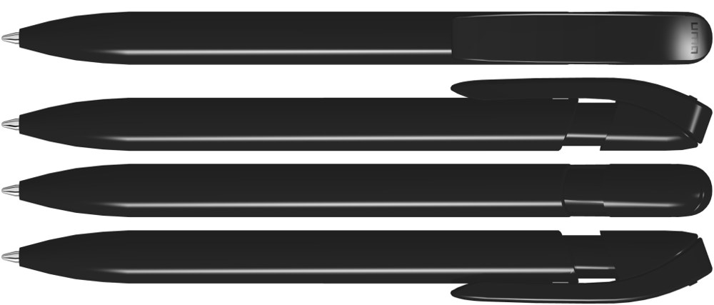 Druckkugelschreiber mit gedeckt glänzendem Gehäuse in uni weiß oder schwarz und farbig transparent glänzende Manschette.
