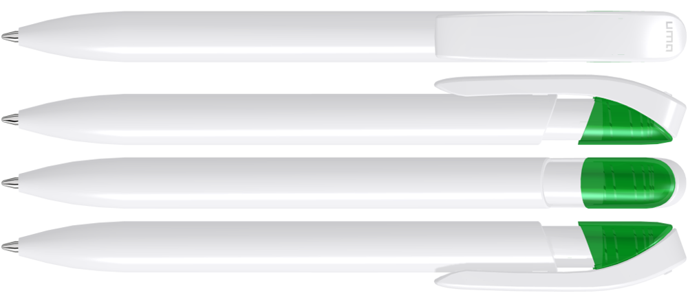 Druckkugelschreiber mit gedeckt glänzendem Gehäuse in uni weiß oder schwarz und farbig transparent glänzende Manschette.