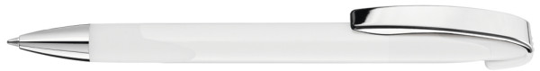 Druckkugelschreiber mit gedeckt glänzendem Gehäuse, Gummigriffzone, schwerer Metallspitze und Metallclip glanzverchromt.