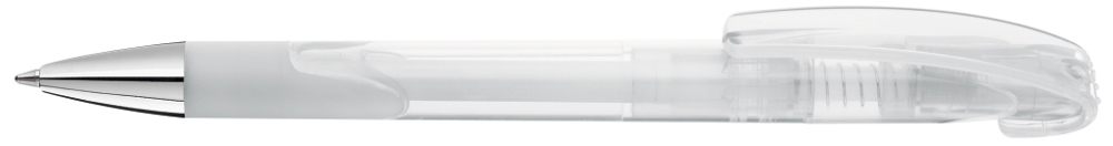Druckkugelschreiber mit transparent glänzendem Gehäuse, Gummigriffzone und schwerer Metallspitze glanzverchromt.