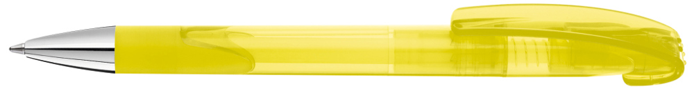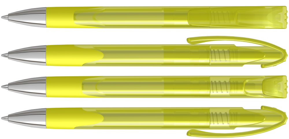 Druckkugelschreiber mit transparent glänzendem Gehäuse, Gummigriffzone und schwerer Metallspitze glanzverchromt.