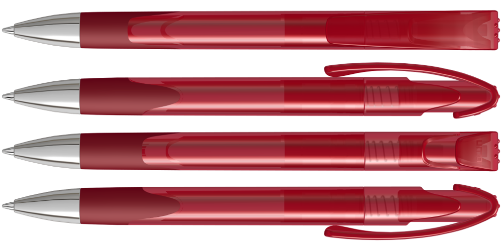 Druckkugelschreiber mit transparent glänzendem Gehäuse, Gummigriffzone und schwerer Metallspitze glanzverchromt.