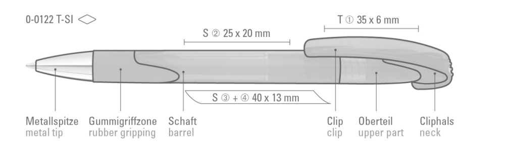 Druckkugelschreiber mit transparent glänzendem Gehäuse, Gummigriffzone und schwerer Metallspitze glanzverchromt.