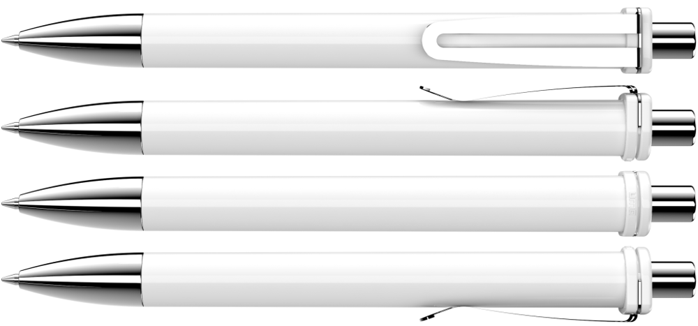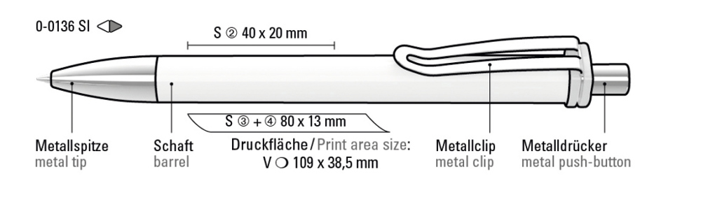 Druckkugelschreiber mit gedeckt glänzendem Schaft und Clipaufhängung. Breiter Metallbiegeclip, Metallspitze und Metalldrücker glanzverchromt.