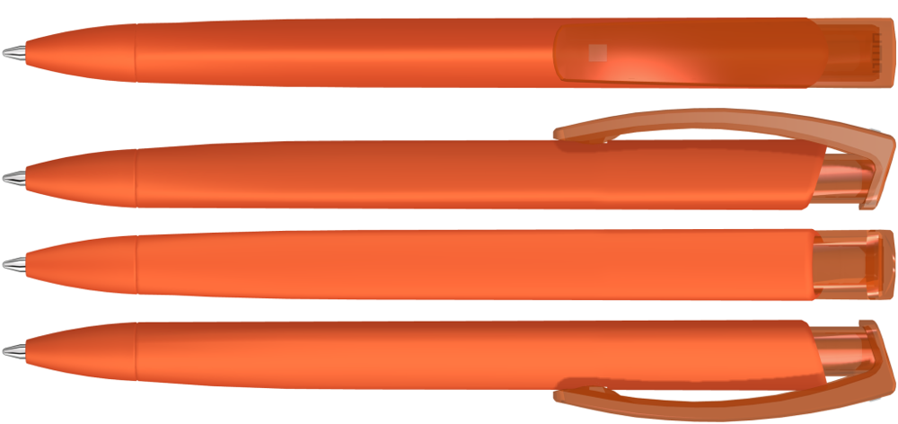 Druckkugelschreiber mit gummiertem Dreikantgehäuse und transparent glänzendem Clip.