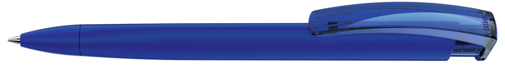 Druckkugelschreiber mit gummiertem Dreikantgehäuse und transparent glänzendem Clip.