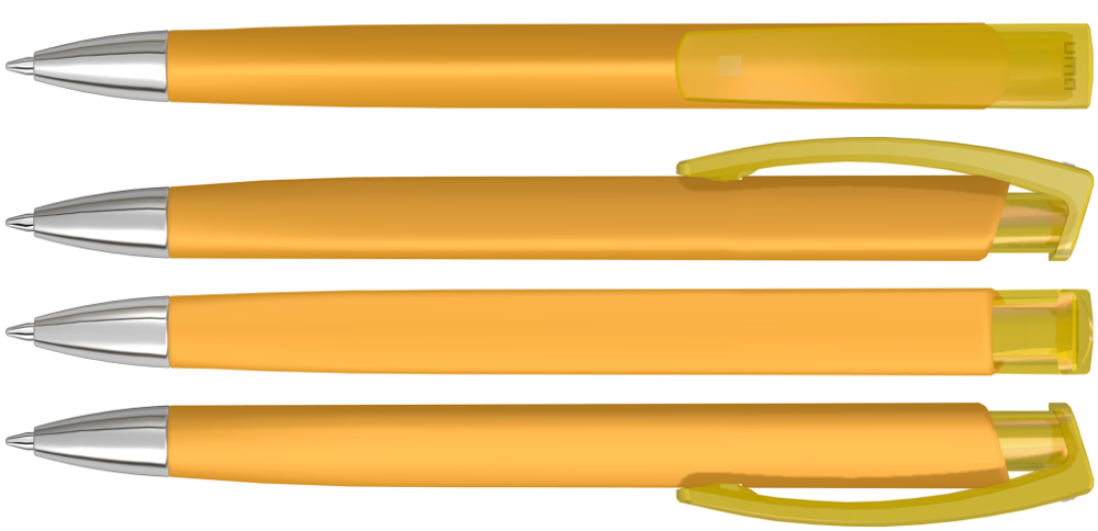 Druckkugelschreiber mit gummiertem Dreikantgehäuse, transparent glänzendem Clip und schwerer Metallspitze glanzverchromt.