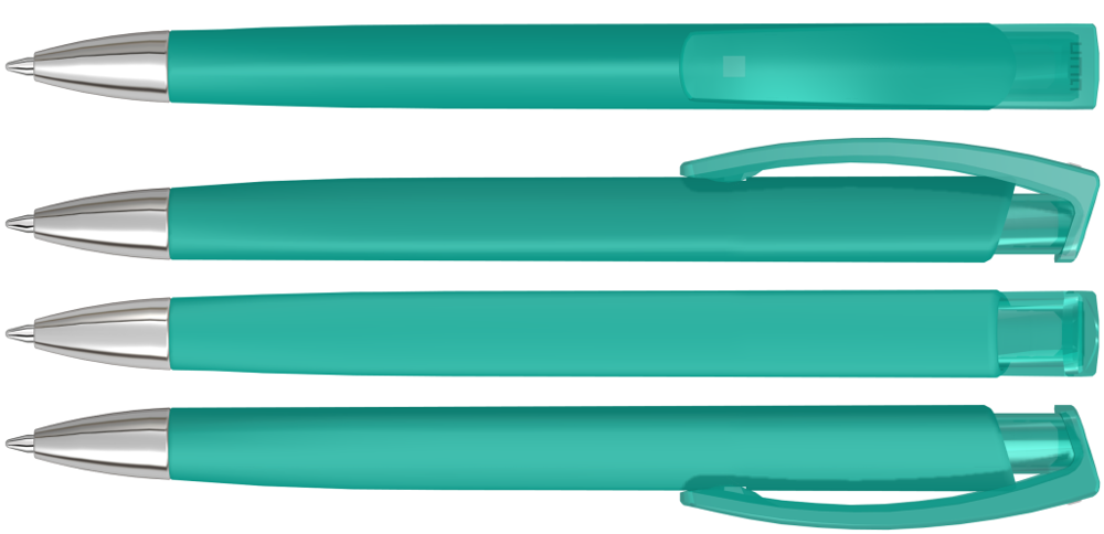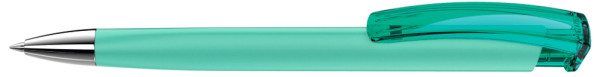 Druckkugelschreiber mit gummiertem Dreikantgehäuse, transparent glänzendem Clip und schwerer Metallspitze glanzverchromt.
