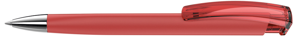 Druckkugelschreiber mit gummiertem Dreikantgehäuse, transparent glänzendem Clip und schwerer Metallspitze glanzverchromt.
