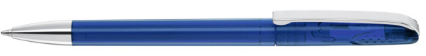 Drehkugelschreiber mit glänzend transparentem Gehäuse, schwerer Metallspitze und Metallclip. Griffnoppen in der Kappe unterstützen den komfortablen Drehmachanismus.