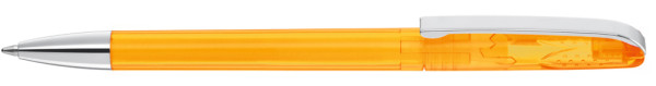 Drehkugelschreiber mit glänzend transparentem Gehäuse, schwerer Metallspitze und Metallclip. Griffnoppen in der Kappe unterstützen den komfortablen Drehmachanismus.