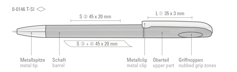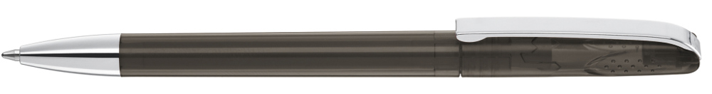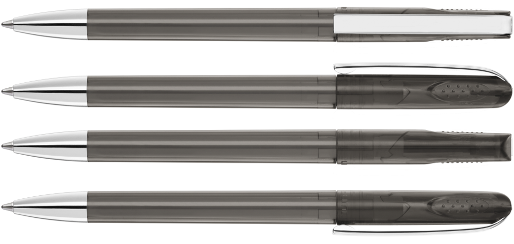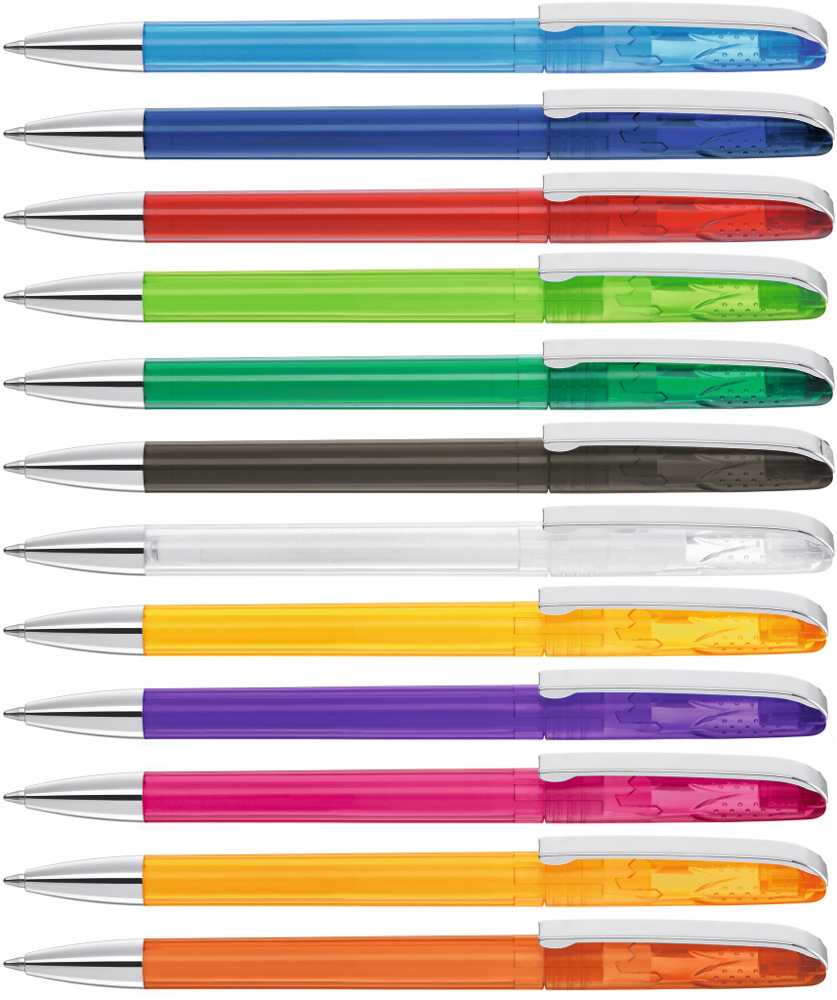 Drehkugelschreiber mit glänzend transparentem Gehäuse, schwerer Metallspitze und Metallclip. Griffnoppen in der Kappe unterstützen den komfortablen Drehmachanismus.