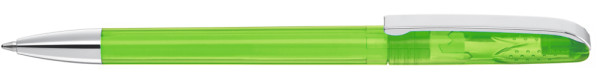 Drehkugelschreiber mit glänzend transparentem Gehäuse, schwerer Metallspitze und Metallclip. Griffnoppen in der Kappe unterstützen den komfortablen Drehmachanismus.