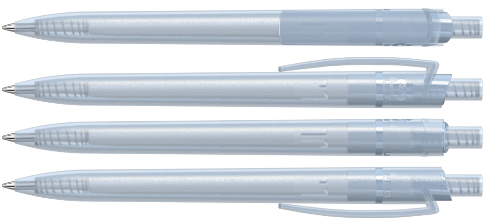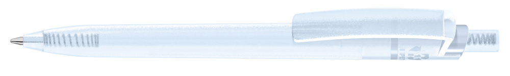 Druckkugelschreiber aus recyceltem PET-Material mit transparent gefrostetem Gehäuse, Clip und Drücker.