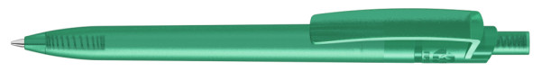 Druckkugelschreiber aus recyceltem PET-Material mit transparent gefrostetem Gehäuse, Clip und Drücker.