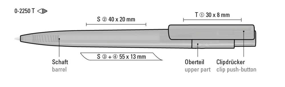 Druckkugelschreiber aus recyceltem PET-Material mit transparent glänzendem Gehäuse und Clip.