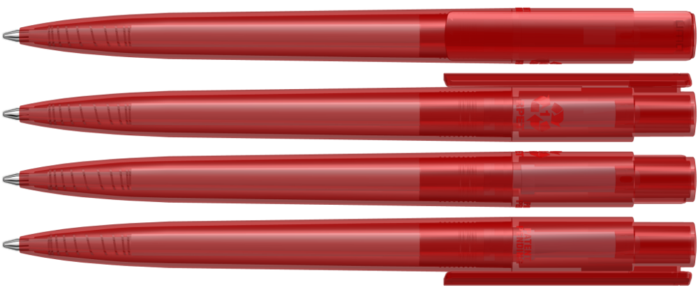 Druckkugelschreiber aus recyceltem PET-Material mit transparent glänzendem Gehäuse und Clip.