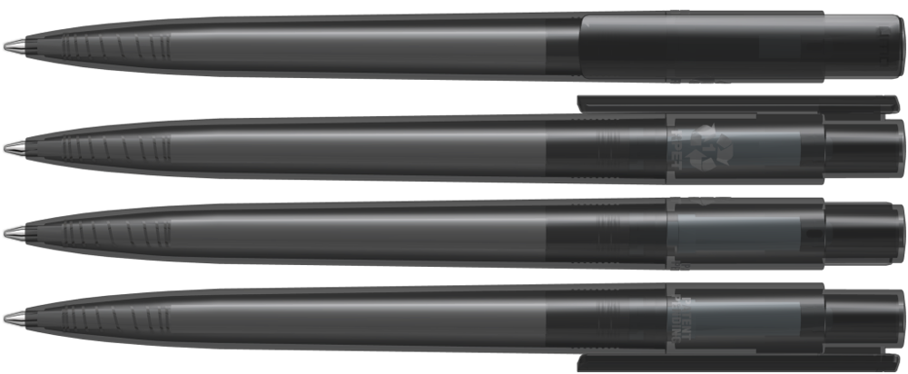 Druckkugelschreiber aus recyceltem PET-Material mit transparent glänzendem Gehäuse und Clip.