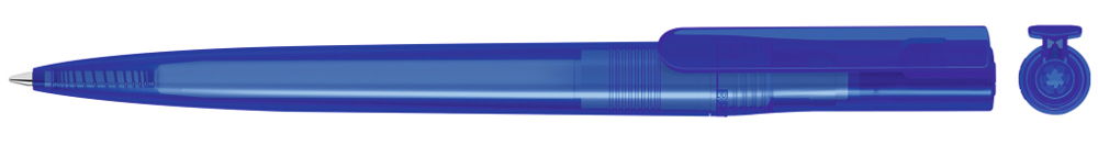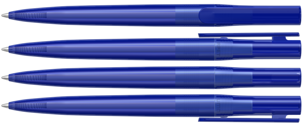 Drehkugelschreiber aus recyceltem PET-Material mit transparent glänzendem Gehäuse.
