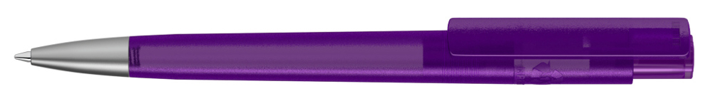 Druckkugelschreiber aus recyceltem PET-Material mit transparent gefrostetem Gehäuse und Clip sowie Metallspitze aus recyceltem Aluminium in silber matt.