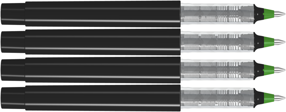 Rollerball mit Gehäuse aus recyceltem PET-Material in gedeckt glänzend weiß oder schwarz. Stopfen in den 8 möglichen Schreibfarben.