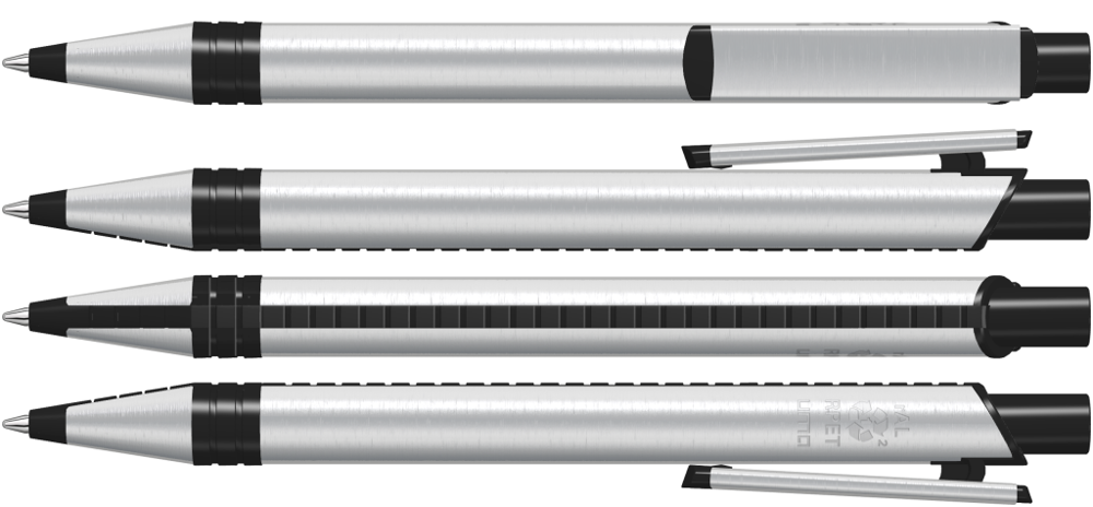 Metall-Druckkugelschreiber mit Metallspitze, Metallschaft und Metallclip aus recyceltem Aluminium, Kunststoffteile aus recyceltem PET-Material in gedeckt schwarz und gedeckt farbigem Drücker.