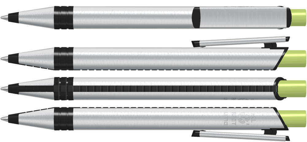 Metall-Druckkugelschreiber mit Metallspitze, Metallschaft und Metallclip aus recyceltem Aluminium, Kunststoffteile aus recyceltem PET-Material in gedeckt schwarz und gedeckt farbigem Drücker.