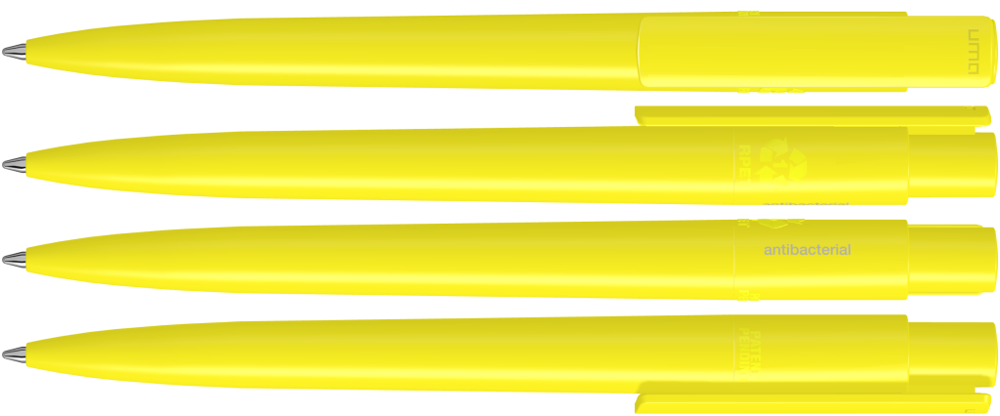 Druckkugelschreiber aus recyceltem, antibakteriellem und antiviralem rPET in gedeckt glänzendem Gehäuse und Clip. Der nach ISO 22196 und ISO 21702 geprüfte antimikrobielle Zusatz verleiht dem rPET eine antibakterielle und antivirale Wirkung auch gegen Corona-Viren. Die Haftung und Ansiedlung von Bakterien oder Krankheitserregern auf der Oberfläche des Schreibgerätes wird um 99,99% verringert. Der in das rPET Material eingearbeitete antimikrobielle Zusatz kann nicht abgerieben oder abgegeben werden und wirkt über die gesamte Lebensdauer des Schreibgerätes. Eine dauerhafte Reduzierung von Krankheitserregern ist gegeben.