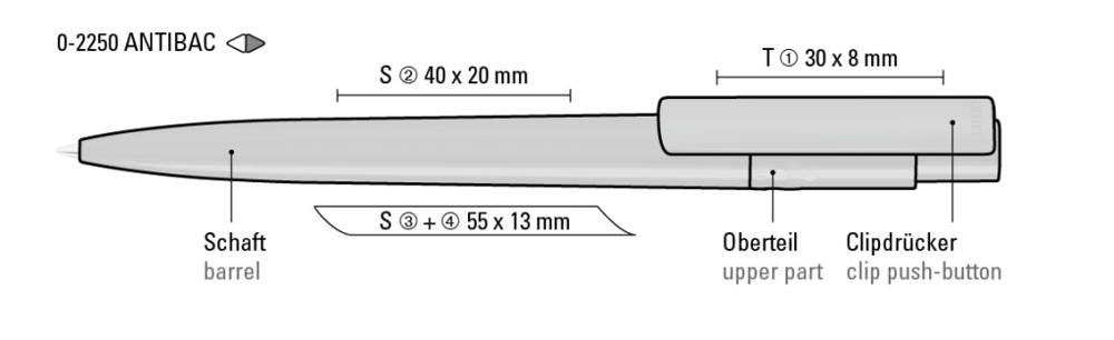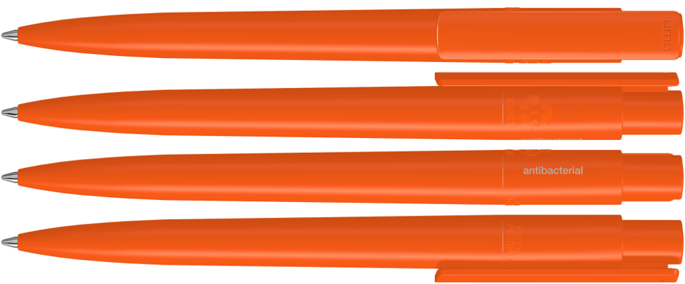 Druckkugelschreiber aus recyceltem, antibakteriellem und antiviralem rPET in gedeckt glänzendem Gehäuse und Clip. Der nach ISO 22196 und ISO 21702 geprüfte antimikrobielle Zusatz verleiht dem rPET eine antibakterielle und antivirale Wirkung auch gegen Corona-Viren. Die Haftung und Ansiedlung von Bakterien oder Krankheitserregern auf der Oberfläche des Schreibgerätes wird um 99,99% verringert. Der in das rPET Material eingearbeitete antimikrobielle Zusatz kann nicht abgerieben oder abgegeben werden und wirkt über die gesamte Lebensdauer des Schreibgerätes. Eine dauerhafte Reduzierung von Krankheitserregern ist gegeben.