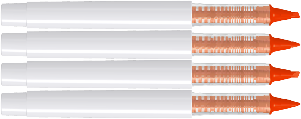Flüssig-Textmarker mit Gehäuse aus recyceltem PET-Material in gedeckt glänzend weiß oder schwarz. Stopfen in den 6 möglichen Schreibfarben.