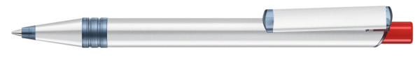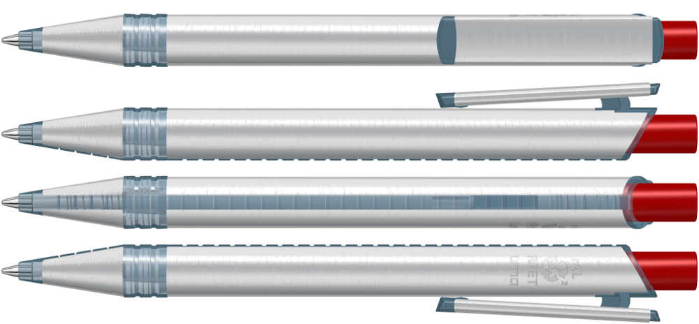 Metall-Druckkugelschreiber mit Metallspitze, Metallschaft und Metallclip aus recyceltem Aluminium, Kunststoffteile aus recyceltem PET-Material in klar transparent und gedeckt farbigem Drücker.