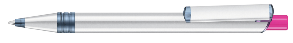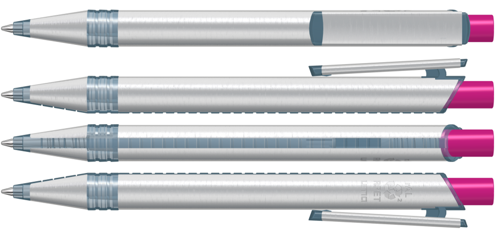 Metall-Druckkugelschreiber mit Metallspitze, Metallschaft und Metallclip aus recyceltem Aluminium, Kunststoffteile aus recyceltem PET-Material in klar transparent und gedeckt farbigem Drücker.