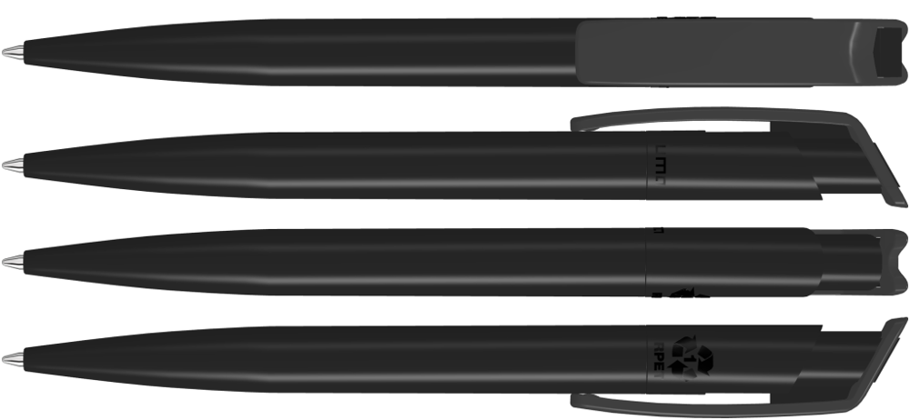 Druckkugelschreiber aus recyceltem PET-Material mit gedeckt glänzendem Gehäuse und Stopfen.