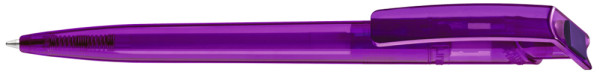 Druckkugelschreiber aus recyceltem PET-Material mit transparent glänzendem Gehäuse und gedecktem Stopfen.