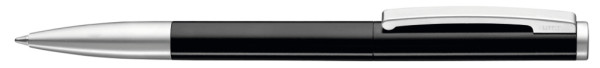 Metall-Drehkugelschreiber mit gefedertem Clip. Oberfläche in silber matt mit glänzenden Beschlagteilen oder schwarz bzw. weiß glänzend mit matten Beschlägen.