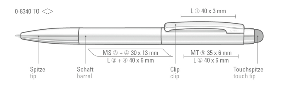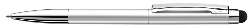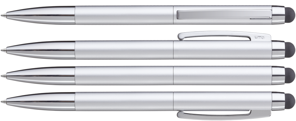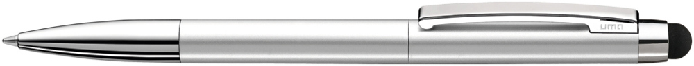 Metall-Drehkugelschreiber mit gefedertem Clip. Oberfläche in silber matt mit glänzenden Beschlagteilen. Touchfunktion im Oberteil.