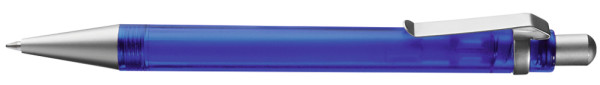 Druckkugelschreiber mit transparent gefrostetem oder gedecktem Gehäuse. Metalldrücker, Metallclip und Metallspitze matt verchromt.