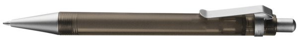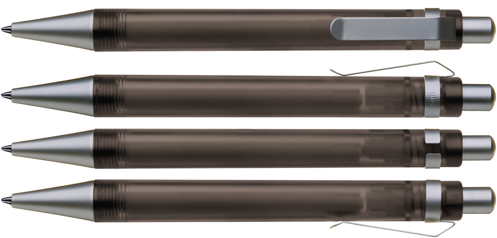 Druckkugelschreiber mit transparent gefrostetem oder gedecktem Gehäuse. Metalldrücker, Metallclip und Metallspitze matt verchromt.