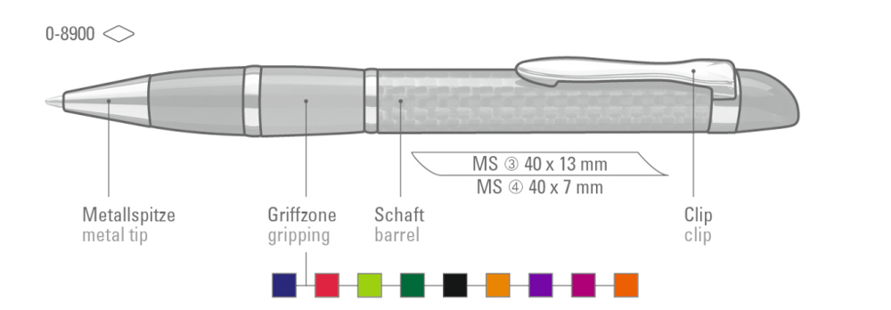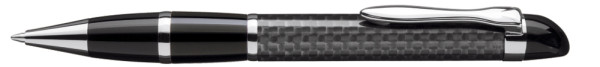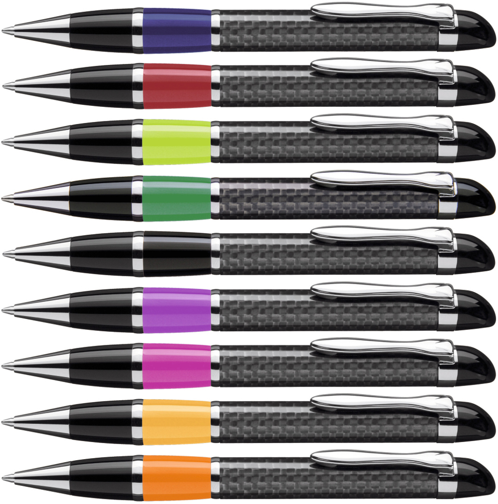 Edler Carbonfaser Metalldrehkugelschreiber mit farbiger Griffzone, flexiblem Metallclip, Metallzierring und Metallspitze glanzverchromt.