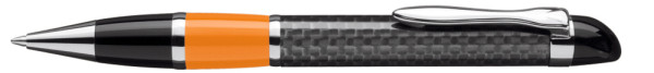 Edler Carbonfaser Metalldrehkugelschreiber mit farbiger Griffzone, flexiblem Metallclip, Metallzierring und Metallspitze glanzverchromt.