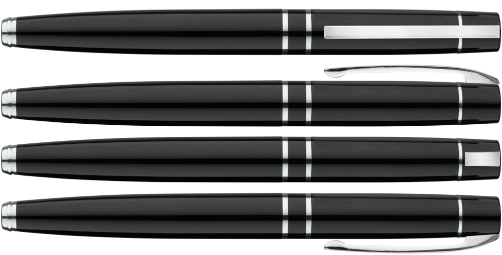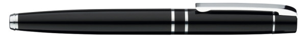 Metall-Rollerball mit gefedertem Clip und schwarzer Gummigriffzone. Beschlagteile glanzverchromt.