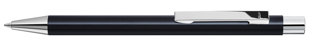 Metall-Druckkugelschreiber mit mattem Gehäuse. Metallclip, Metallspitze und Drücker silber glänzend.