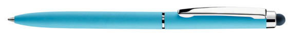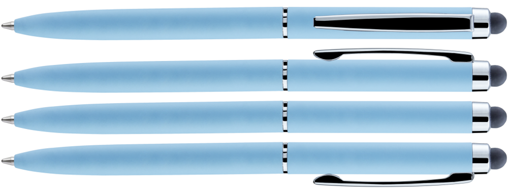 Metall-Drehkugelschreiber mit farbig mattem oder weiß glänzendem Gehäuse und silber glänzenden Beschlagteilen. Gummiertes Schaftende für die Touchscreensteuerung.