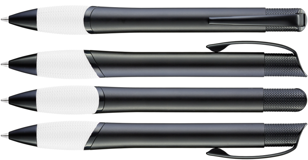 Metall-Druckkugelschreiber mit schwarz matt lackiertem Gehäuse, farbige Gummigriffzone und matt schwarzen Beschlagteilen.