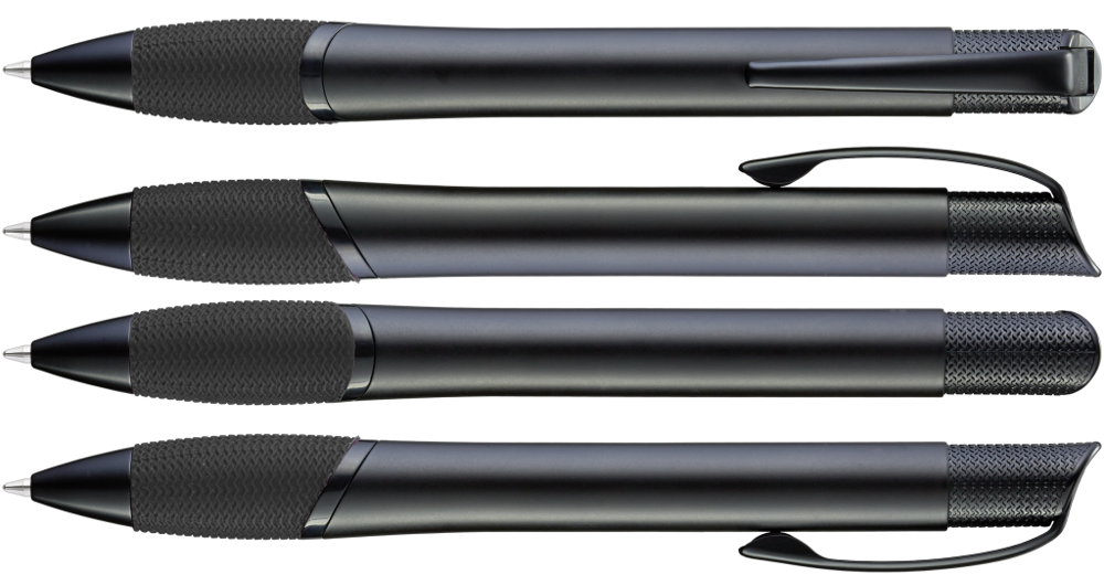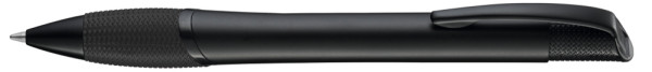Metall-Druckkugelschreiber mit schwarz matt lackiertem Gehäuse, farbige Gummigriffzone und matt schwarzen Beschlagteilen.