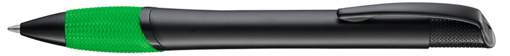 Metall-Druckkugelschreiber mit schwarz matt lackiertem Gehäuse, farbige Gummigriffzone und matt schwarzen Beschlagteilen.