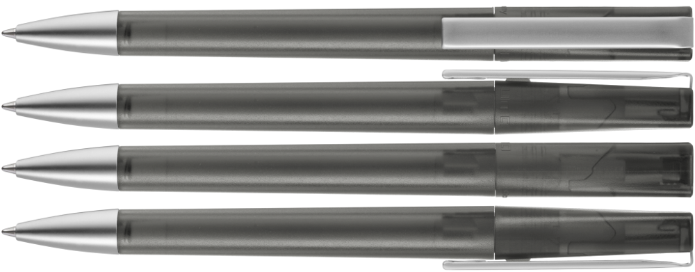 Drehkugelschreiber mit transparent gefrostetem Gehäuse, schwere Metallspitze und Metallclip matt verchromt.