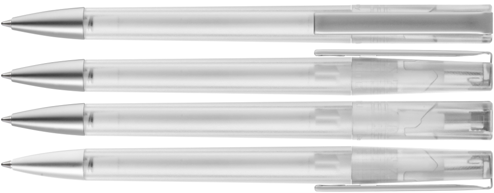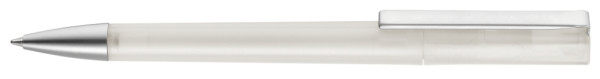 Drehkugelschreiber mit transparent gefrostetem Gehäuse, schwere Metallspitze und Metallclip matt verchromt.